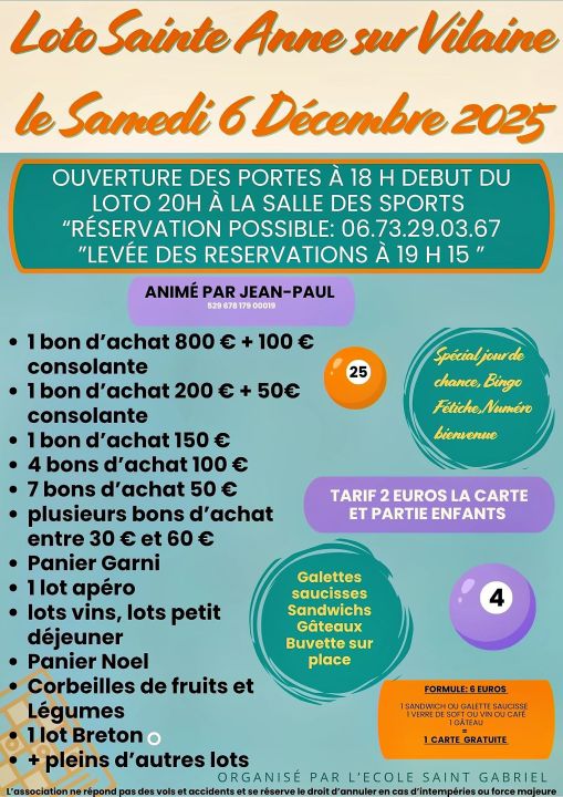 🕡 Ouverture des portes à 18h – Levée des réservations à 19h15 – Début du loto à 20h